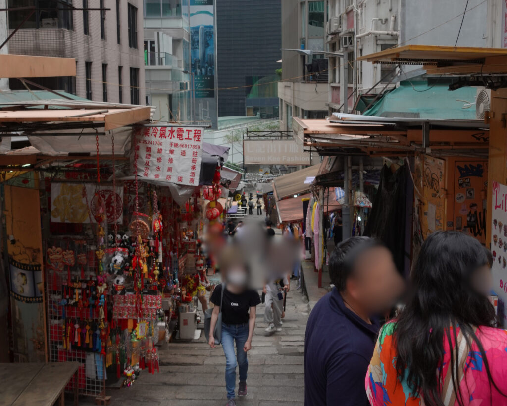 香港らしい景色だと思ったのですが、道路ひとつ渡るのも、大きい道だと地上に信号がなく地下道や陸橋を越えないといけない場合もあります。また、急な階段は電動車いすで移動するムイには自力で行くのが難しい場所です。